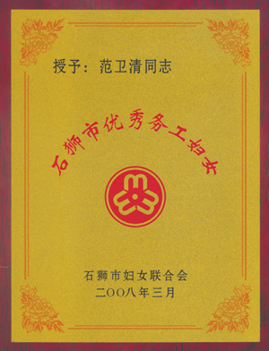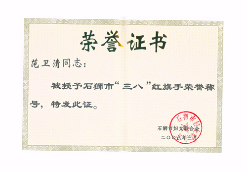 | 范衛清同志被評為“市優秀務工婦女”及“三八”紅旗手榮譽稱號 |