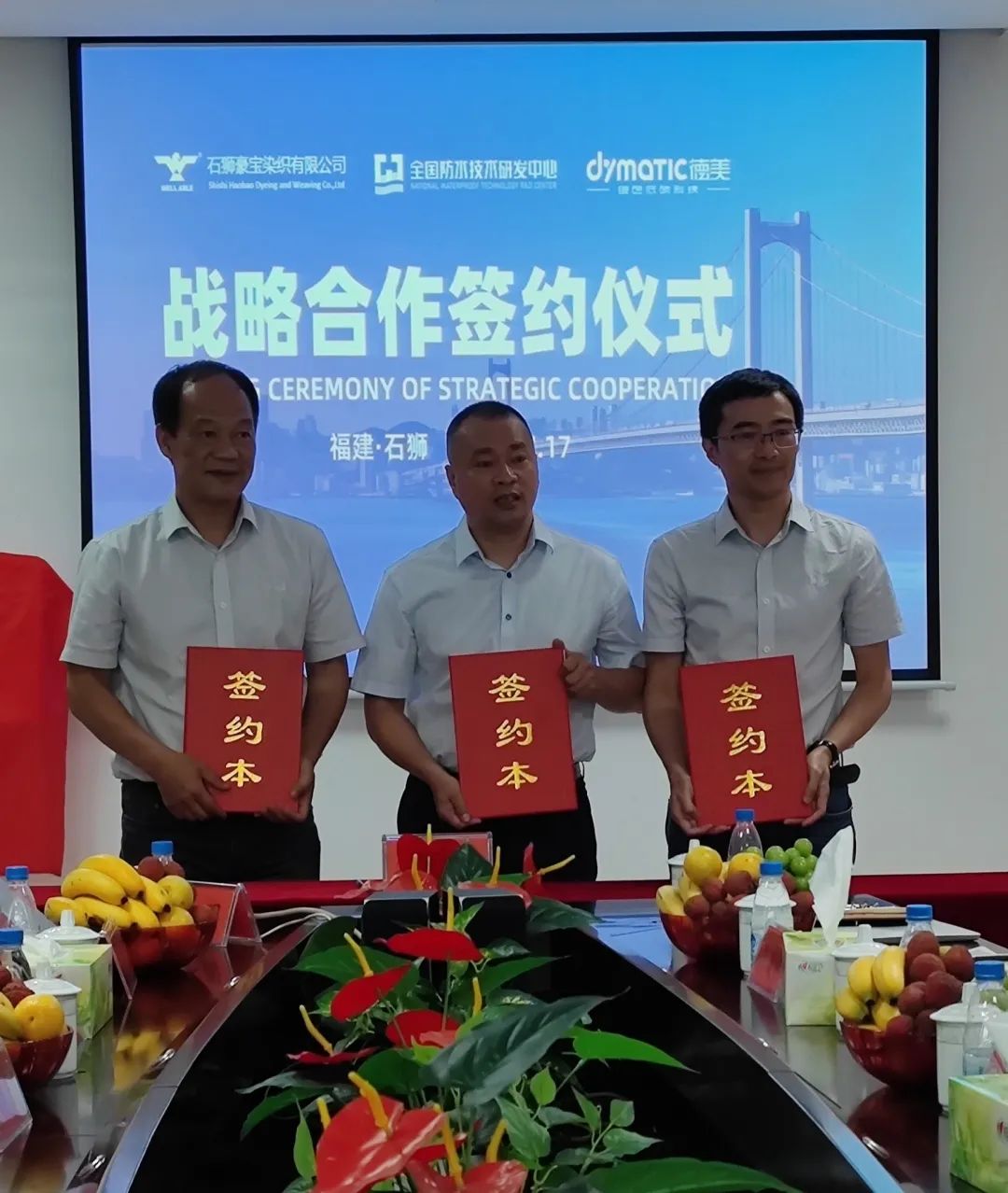 簽約現場 2023年7月17日,石獅市豪寶染織有限公司、全國防水技術研發中心和廣東德美精細化工集團股份有限公司三方簽署建立了防水聯合實驗室合作協議,此舉可以促進三方相互聯系與合作,推動紡織產業技術研發和提質增效。