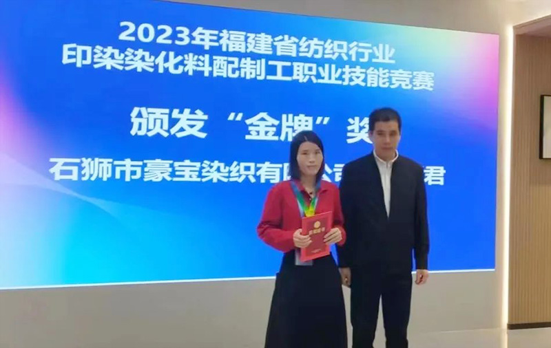 周麗君自2017年5月入職豪寶染織,現(xiàn)任配色副科長,工作矜矜業(yè)業(yè)、任勞任怨、業(yè)務(wù)精湛。這次經(jīng)華寶集團(tuán)工會推選,周麗君作為石獅市印染企業(yè)染化料配制工8名代表之一,參加2023年福建省紡織行業(yè)印染染化料配制工職業(yè)技能競賽,并取得優(yōu)異成績,可喜可賀、振奮人心。希望華寶集團(tuán)的所有員工向周麗君學(xué)習(xí),愛崗敬業(yè),勤勞奉獻(xiàn),不斷精進(jìn)業(yè)務(wù)能力,提高職業(yè)技能水平。